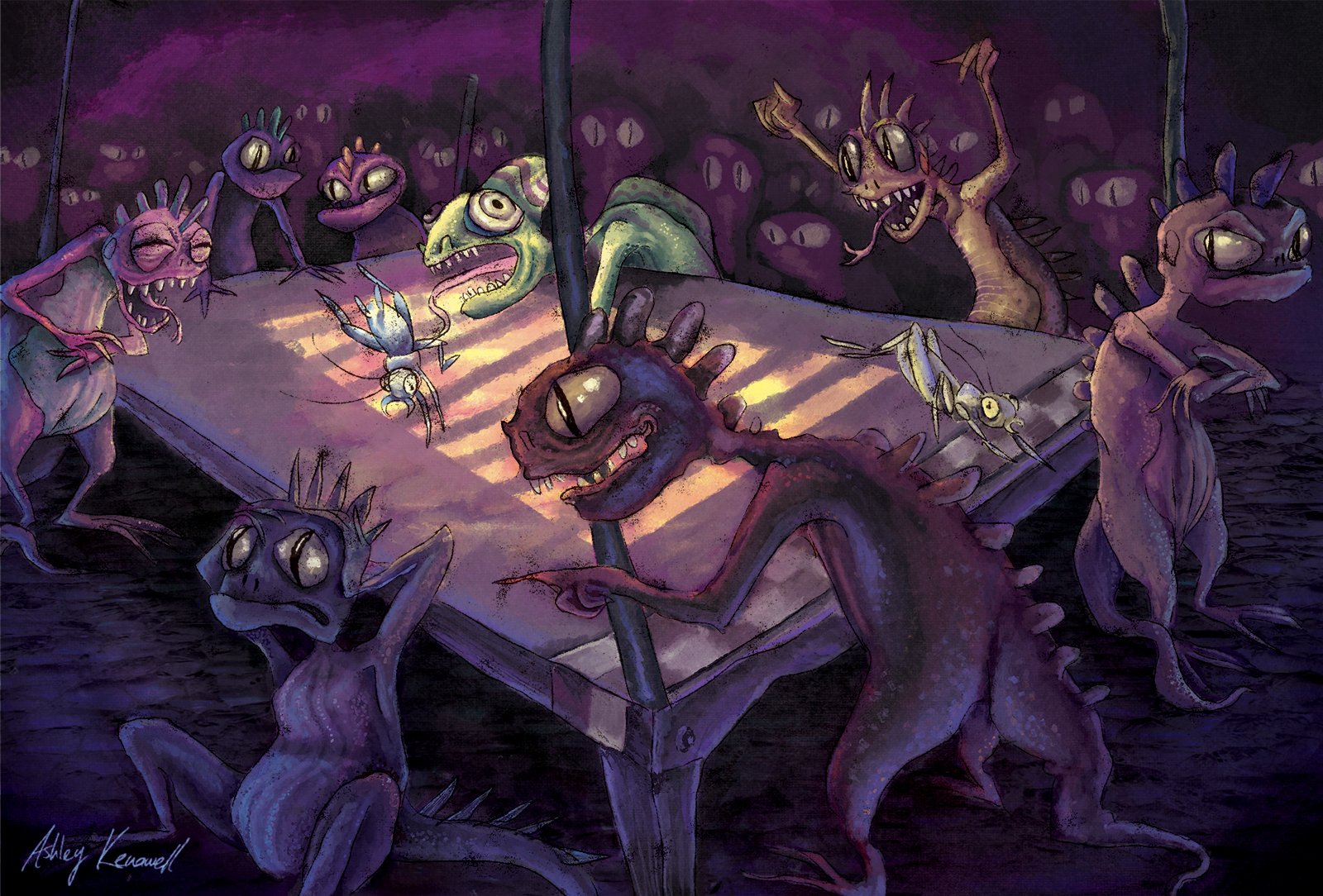 While I did not illustrate a majority of the cards, I did illustrate the two in the last two pictures of this section (“Master of the Viewniverse” and “Lady of the Lizards”). Other illustrations produced by artist Kerri Aitken.